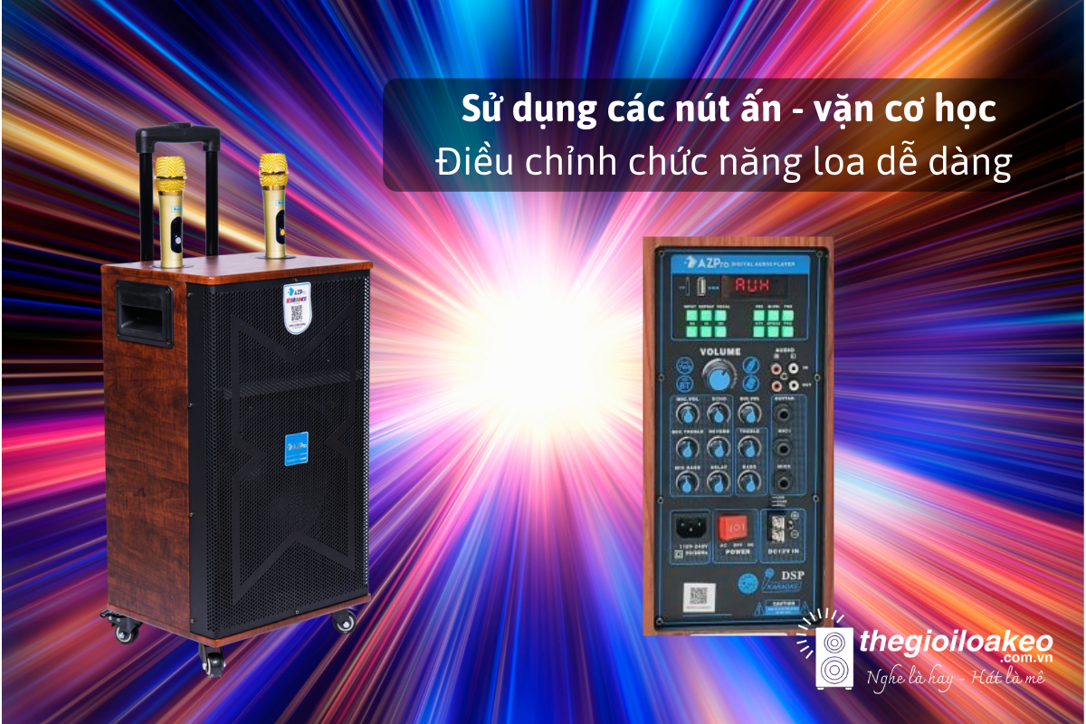 -Loa kéo di động AZPro AZ-1295A Bass 3 tấc kèm 2 Micro không dây kim loại .Chiếc loa chính hãng AZPro AZ-1295A với thiết kế mạnh mẽ vỏ gỗ cứng cáp, ốp góc kim loại sang trọng chống vỡ, màn hình led , loa bass chắc, âm thanh hơn hẳn các loa ngang tầm giá.