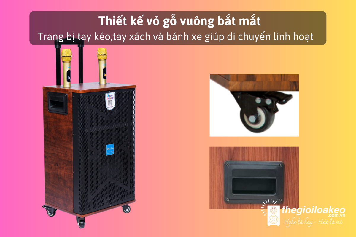 -Loa còn trang bị thêm tay cầm phía sau và 4 bánh xe giúp di chuyển linh hoạt và dễ dàng hơn.